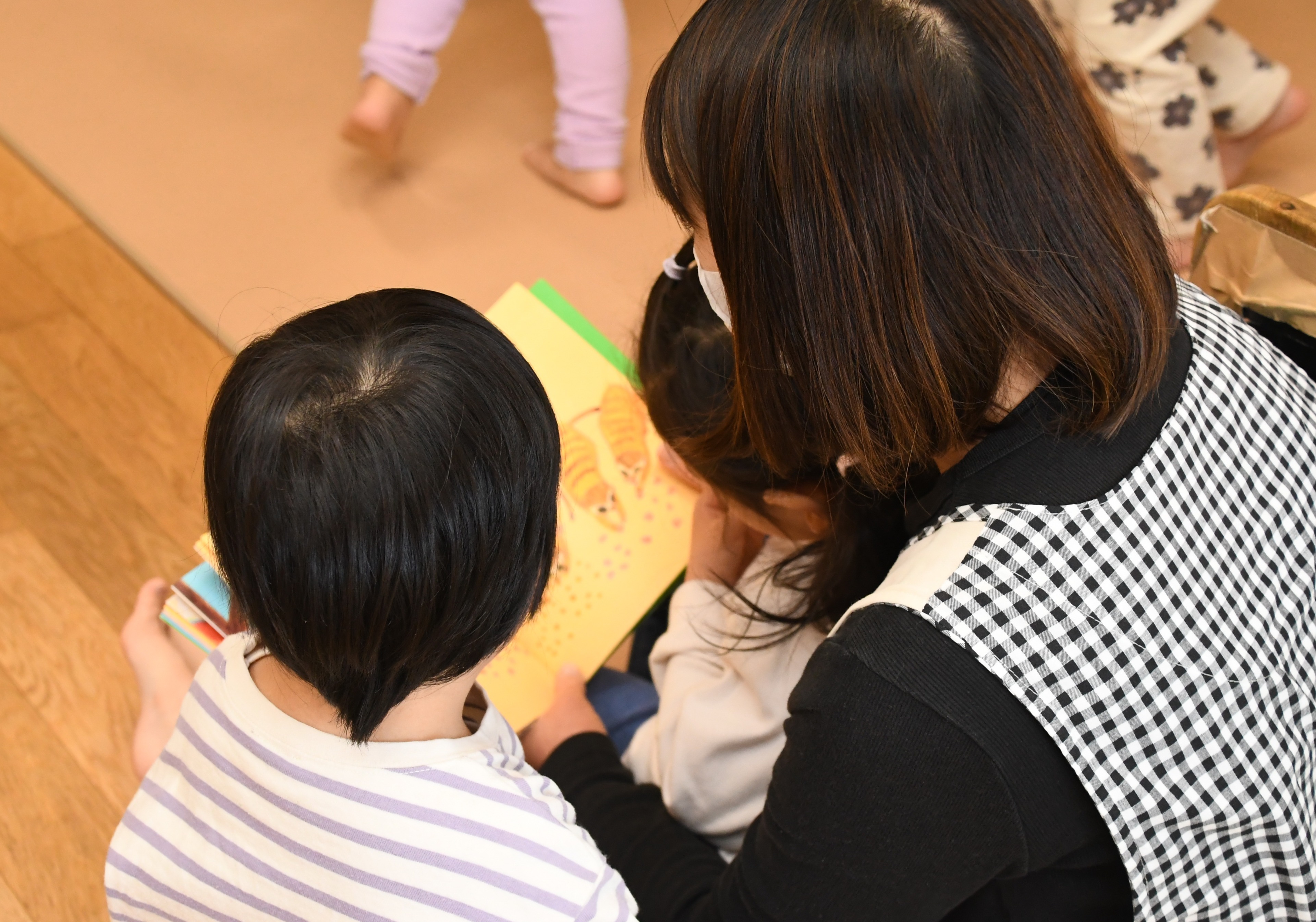 「子どもの心を大切に育てていくために子どもと保育園と保護者が同じ世界を共有する」という趣旨の下、絵本の読み聞かせを保育実践に取り入れます。また絵本への取り組みとして、各クラスには、年齢や季節に合わせた絵本や自分だけの大切な絵本(月刊絵本)を置き、職員と子どもが心を通わせる安心感に包まれる一対一の時間として大切にします。保護者もお子さんと一緒に絵本の世界を共有していただけるよう、本の貸し出しを行っています。